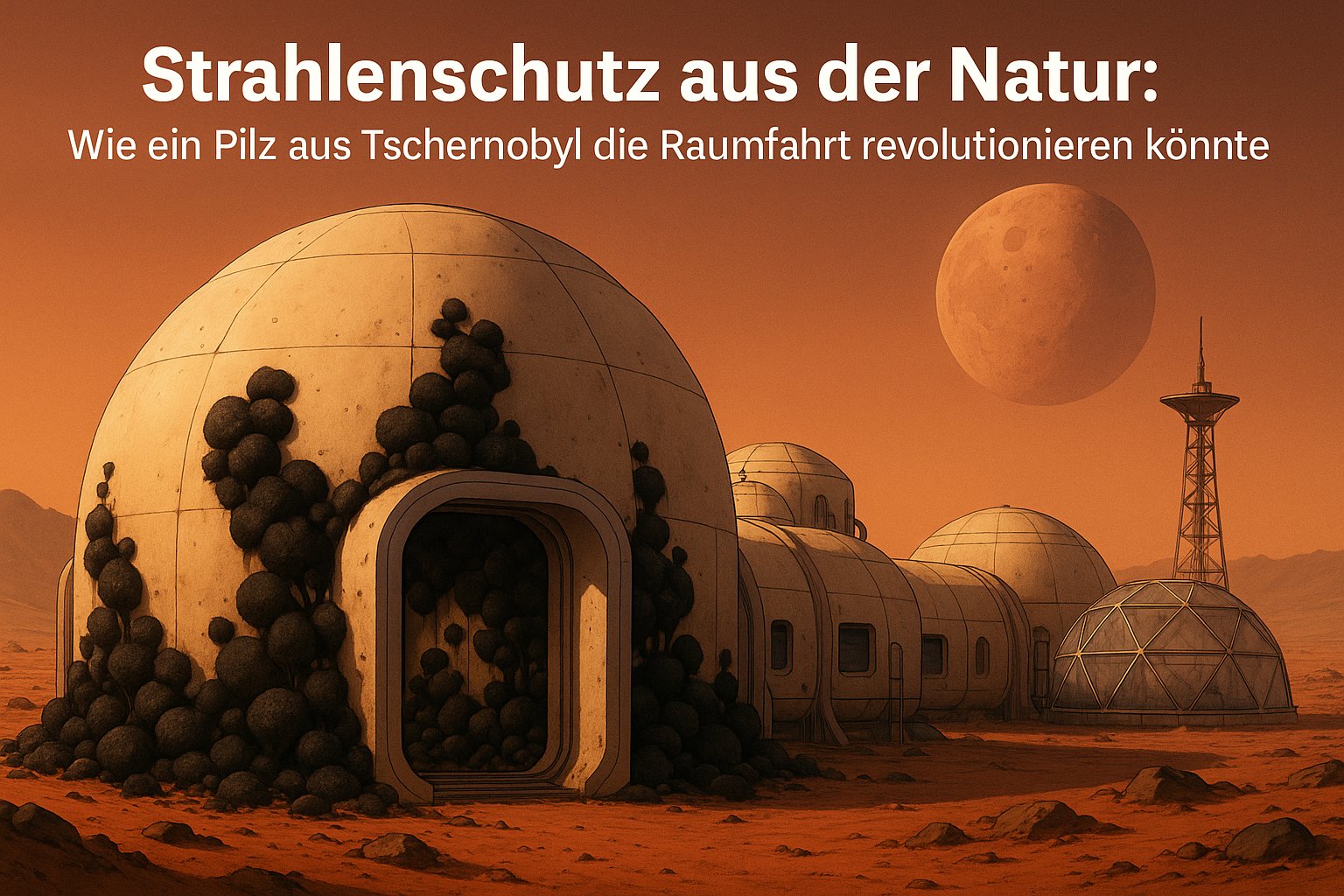 Hier kommt der Tschernobyl-Pilz ins Spiel. Mehrere Experimente, unter anderem an der ISS, zeigten bereits, dass er unter Mikrogravitation wächst und sogar eine messbare Reduktion der Strahlungswerte innerhalb seiner Wachstumszone bewirkt. Denkbar wäre, dass künftige Marskolonien Wände oder Kuppeln mit einer lebenden Schicht dieses Pilzes auskleiden. Der Pilz könnte sich selbst reproduzieren, kleine Schäden ausheilen – und gleichzeitig die Besatzung vor Strahlung schützen.